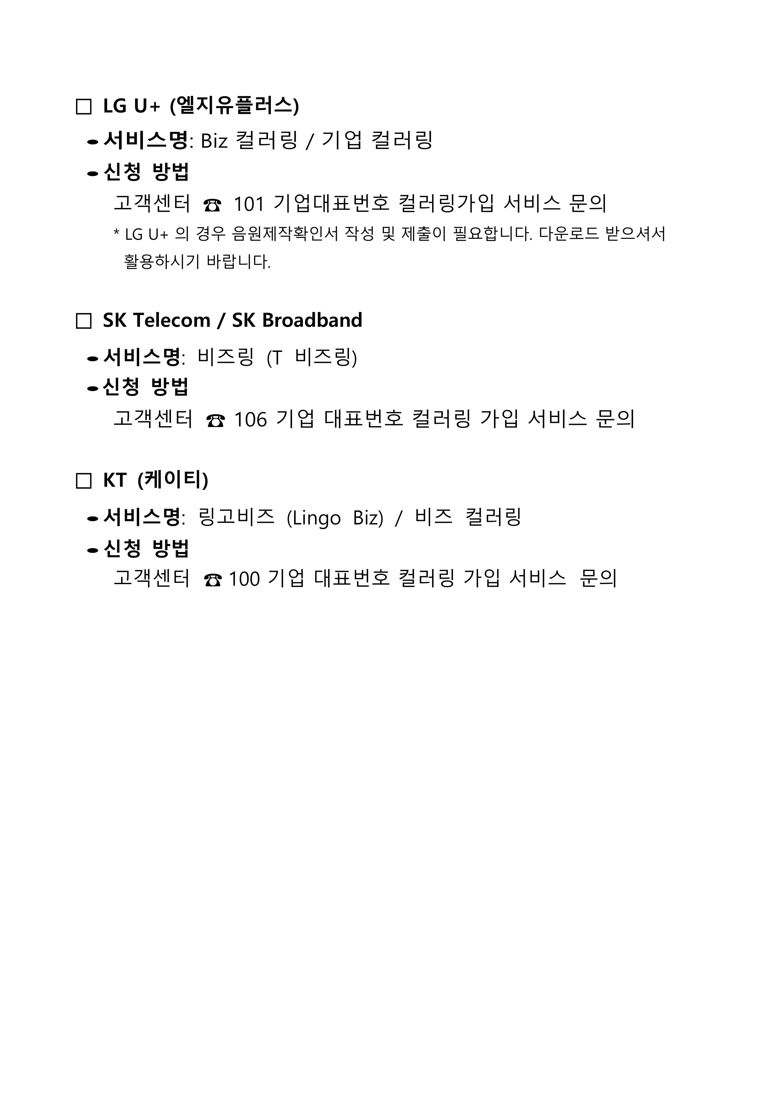 ** LG U+ 를 사용하시는 어린이집의 경우, 첨부파일의 [음원제작확인서] 및 [음원등록요청공문]을 다운로드 받아 작성하여 활용해주시기 바랍니다.