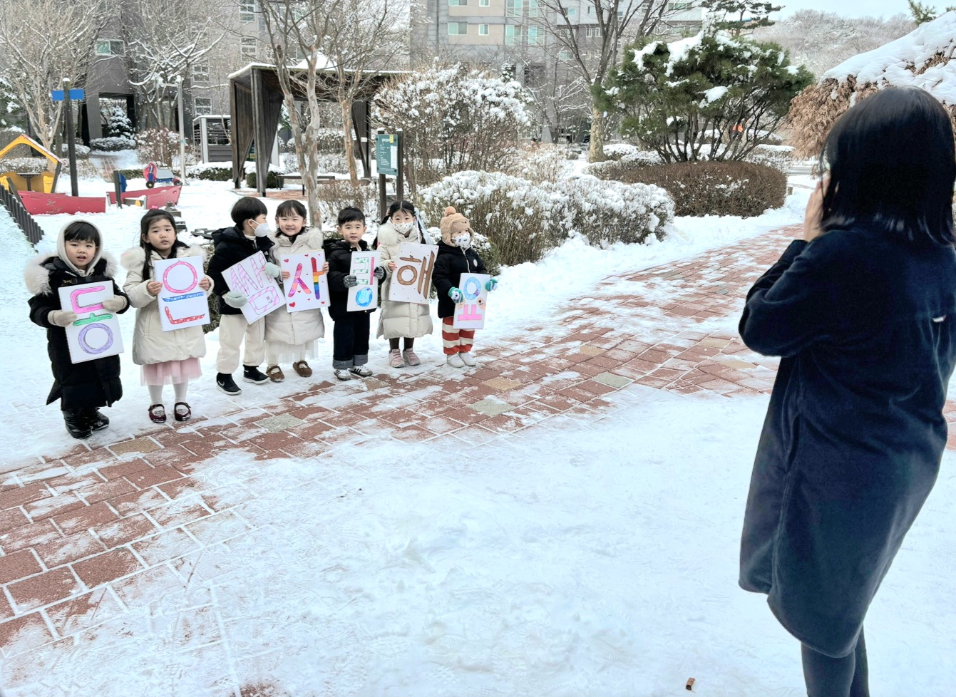 아이들에게 한 글자씩 맡겨 순글자 메시지를 준비하고, 평소 서로 달랐던 등원 시간을 조율해 한 시각에 모였습니다.
